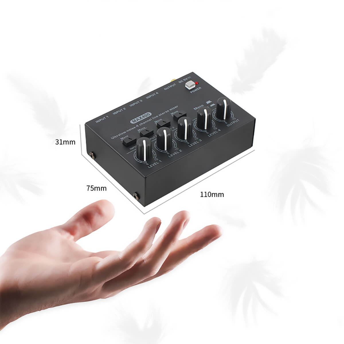 Это стереофонический 4-канальный микшер, позволяющий микшировать микрофон, гитару, бас, клавишные, электронные барабаны и т. д.